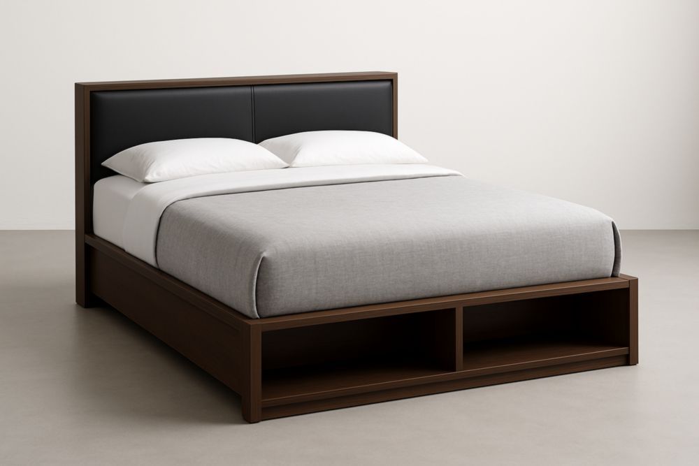 Letto matrimoniale in legno con testiera in similpelle nera e contenitore 200x160×120 cm